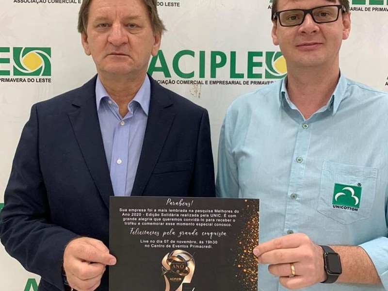 Por mais um ano consecutivo, a UNICOTTON recebeu o troféu de Melhores do Ano 2020 -Edição solidária, na categoria COOPERATIVA AGRíCOLA. Esse evento é realizado pela ACIPLE (Associação Comercial e Empresarial de Primavera do Leste), onde as empresas premiadas são escolhidas pela população do município, através de pesquisas. Esse prêmio consolida a credibilidade da Cooperativa.